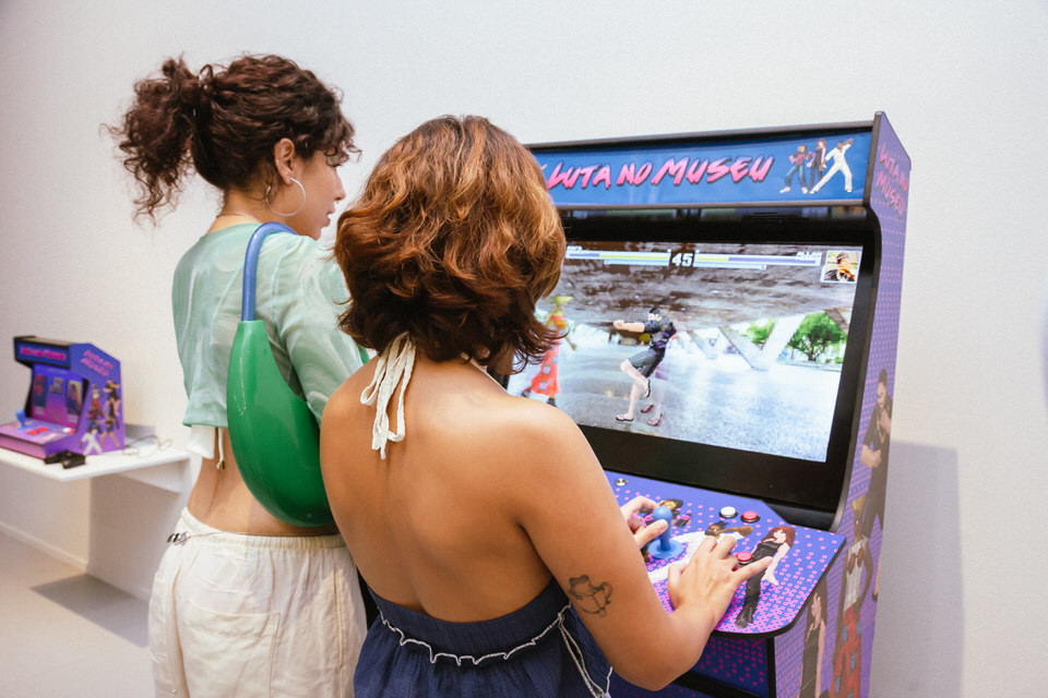 The work commissioned by artist Panmela Castro for the exhibition “Radical Ideas About Love” at the Rio Art Museum was inspired by traditional arcade games, but instead of fighters, the characters are artists who are friends of Panmela. The scenes depicted are important art institutions in Rio, such as the Rio Art Museum, Parque Lage and MAM.