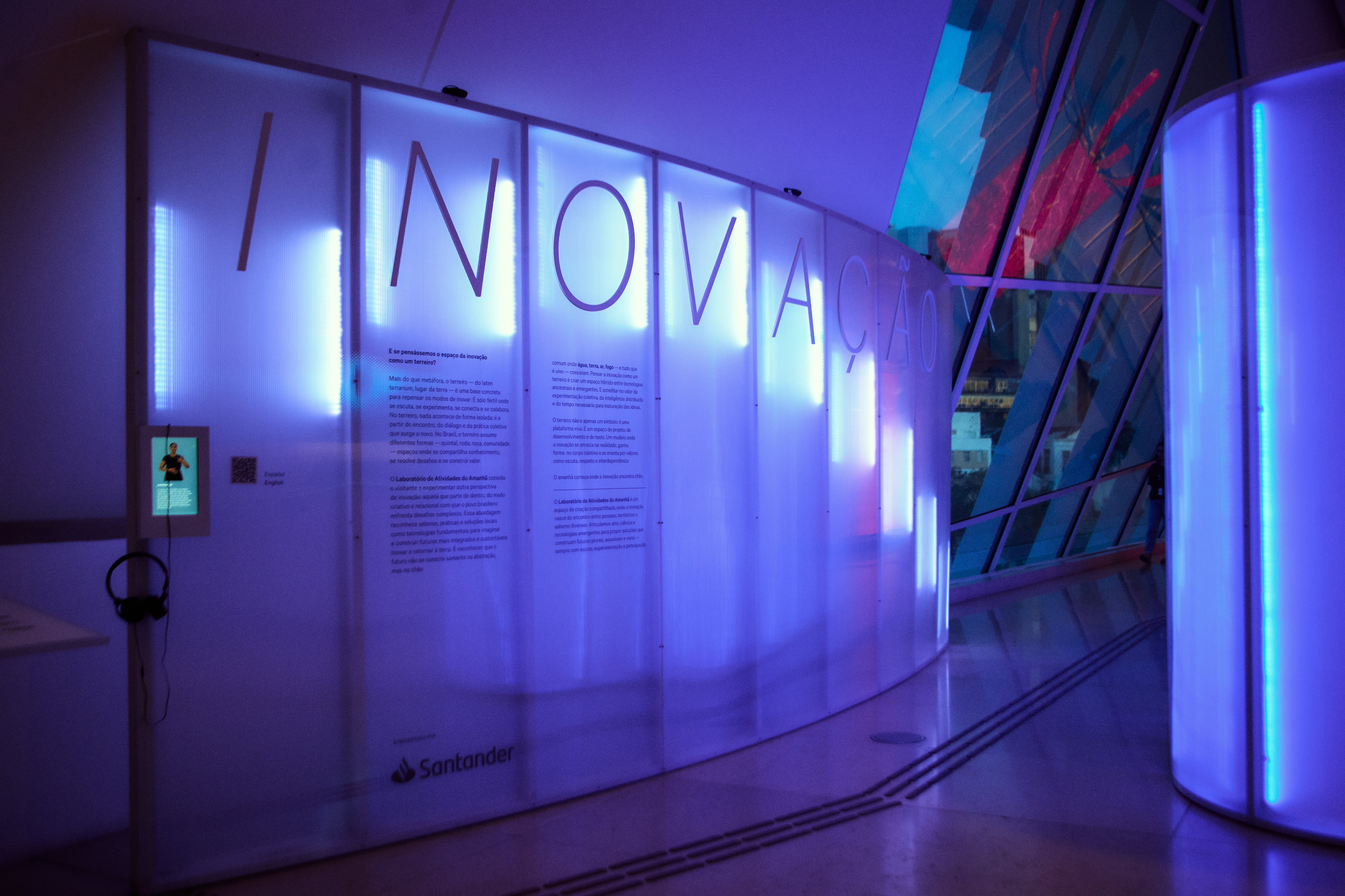 The Innovation Space is a new coexistence environment at the Museu do Amanhã designed to stimulate new ways of thinking and relating to the world. Enveloped in immersive LED lighting, the space features a portal that reacts to visitor entry, a responsive light tree, a space for debating and an interactive game about river ecosystems.